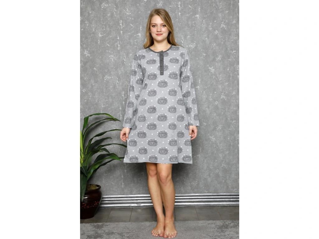 Dámská noční košile v šedé barvě s potiskem roztomilých ježečků. Košilka má kulatý výstřih, dlouhý rukáv a knoflíkovou légou. Pohodlý mírně se rozšiřující střih.