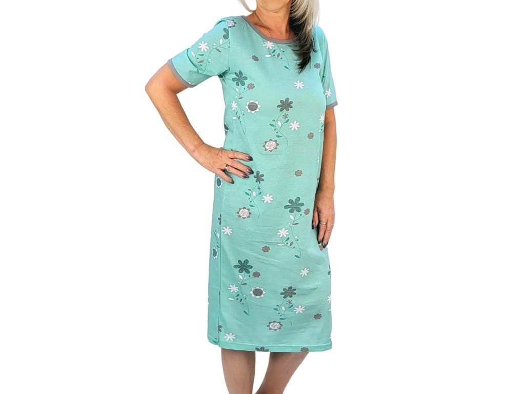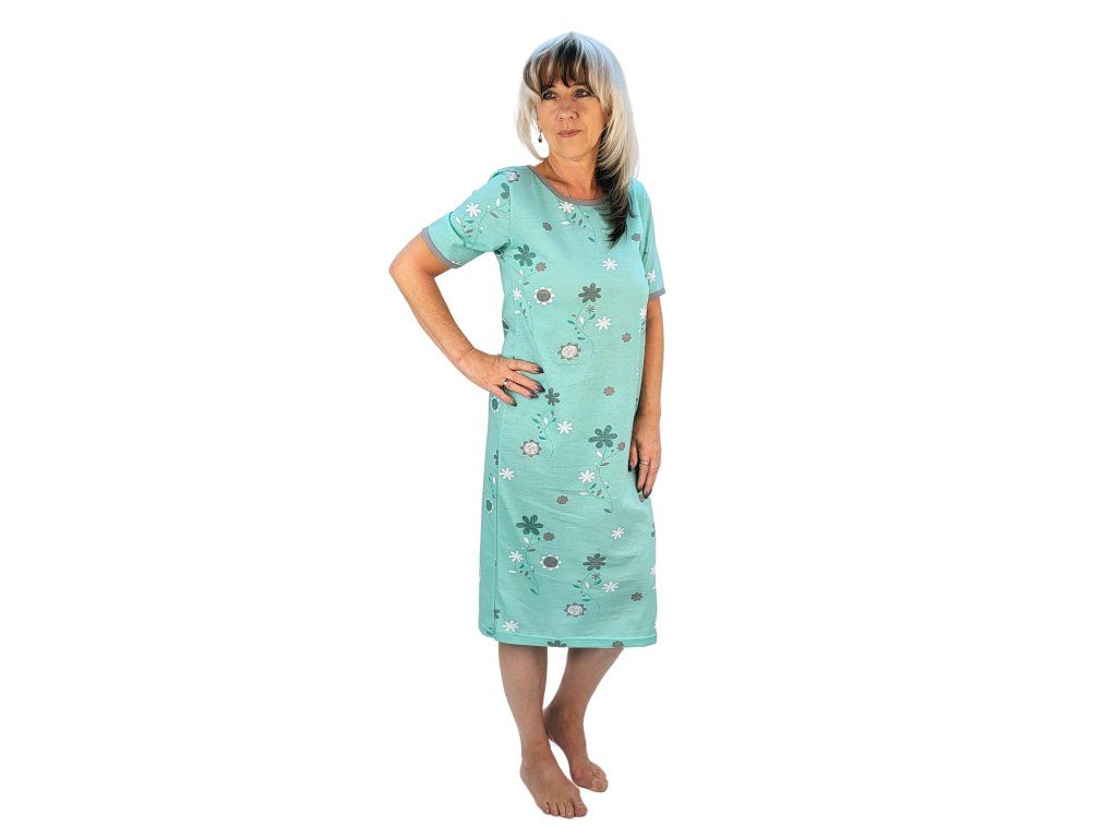 Dlouhá dámská noční košile s celoplošným vzorem. Vyrobena z velmi příjemné certifikované bavlny. Krátké rukávy. Délka noční košile pod kolena.