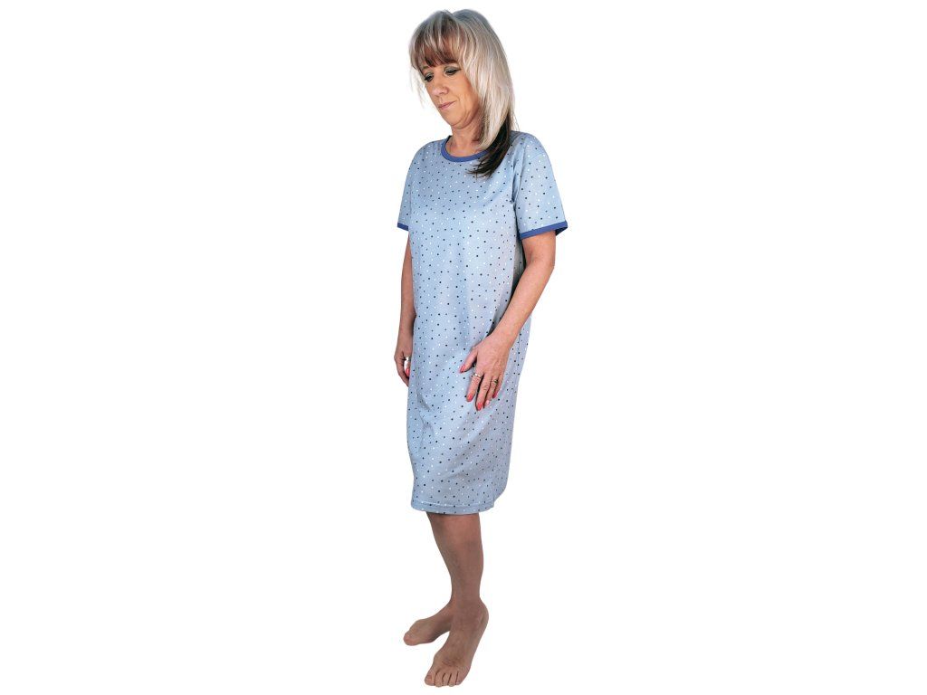 Krátká dámská noční košile s celoplošným vzorem, zdobená jednobarevnou lemovkou. Vyrobena z velmi příjemné certifikované bavlny. Krátké rukávy.
