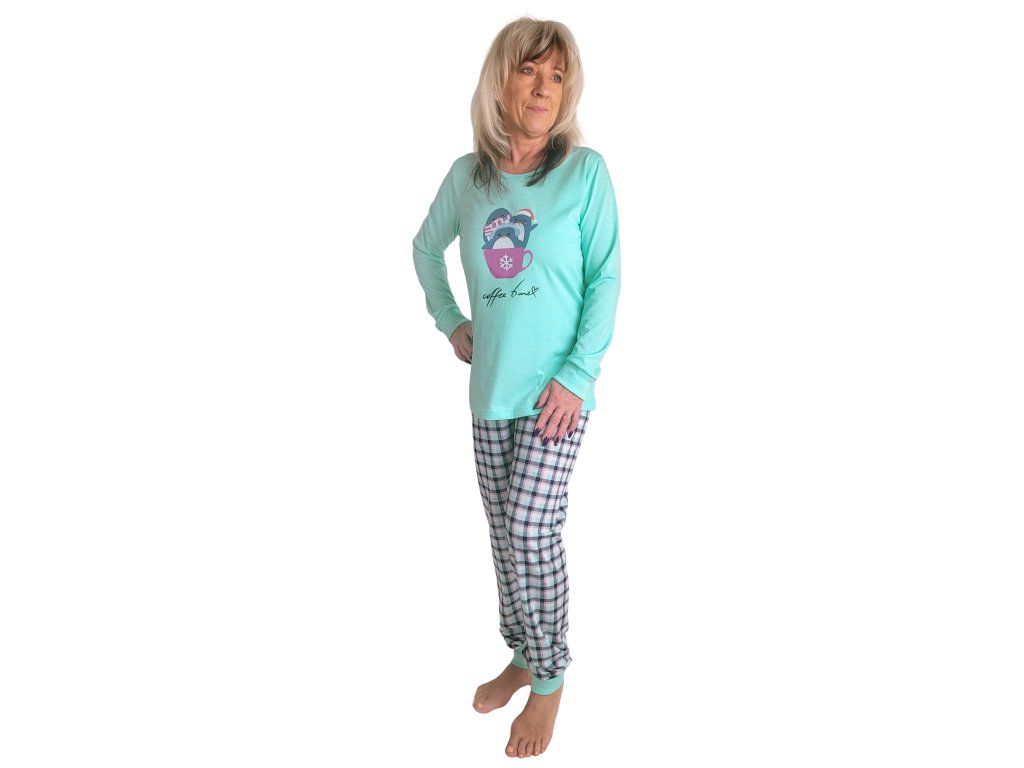 Dámské dlouhé pyžamo s vánočním motivem. Rukávy i nohavice jsou zakončeny praktickými náplety.