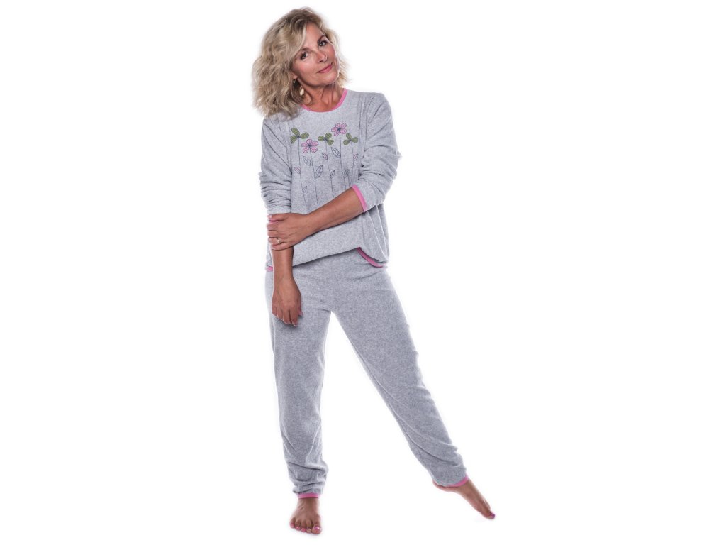 Dámské pyžamo s dlouhým rukávem a dlouhou nohavicí. Vyrobeno z bavlněného úpletu. Celé pyžamo je volného střihu zakončené lemováním v odlišné barvě. Přední díl s potiskem.Doplňkové parametry