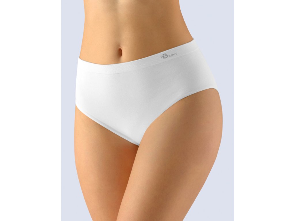 Kalhotky klasického střihu se širším bokem ve větších velikostech, dámské bezešvé prádlo. Pasový kraj je zesílený a zapravený bezešvým způsobem. V nohavičkách je zašitá úzká pruženka. Kalhotky jsou jednobarevné. V záložce je vypletené logo v šedé barvě.