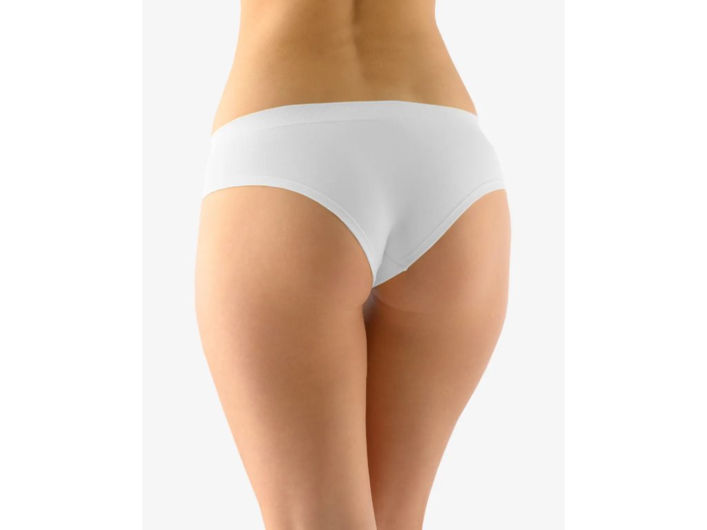 Bokové kalhotky francouzského střihu se širokým bokem, dámské bezešvé prádlo. Pasový kraj je zesílený a zapravený bezešvým způsobem. Nohavičky jsou začištěné podehnutím. Kalhotky jsou jednobarevné. V záložce je vypletené logo v šedé barvě.