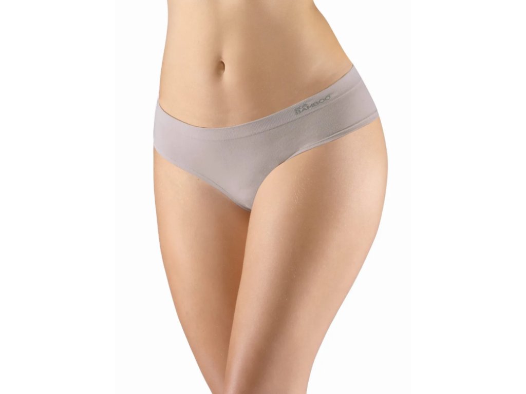 Boková tanga francouzského střihu se širokým bokem, dámské bezešvé prádlo. Pasový kraj je zesílený a zapravený bezešvým způsobem. Nohavičky jsou začištěné podehnutím. Kalhotky jsou jednobarevné. V záložce je vypletené logo.