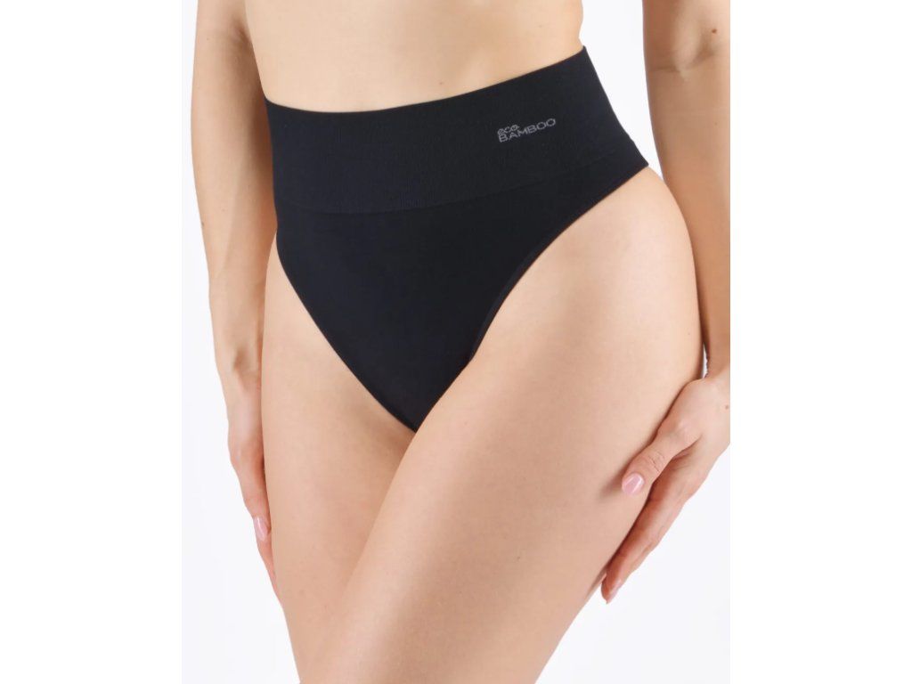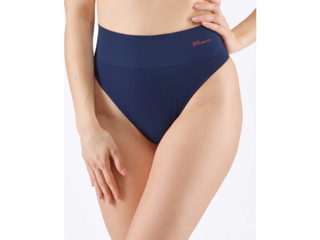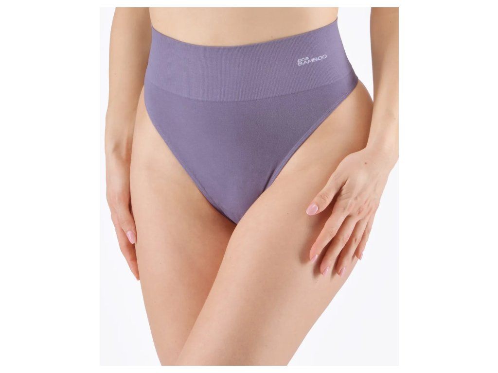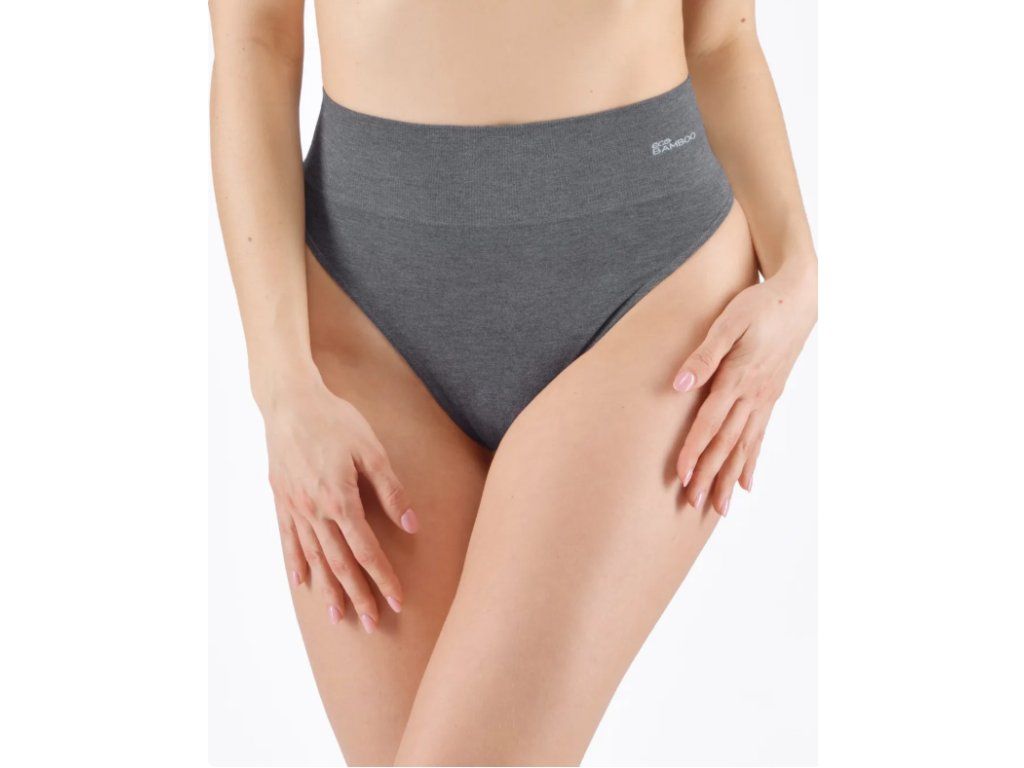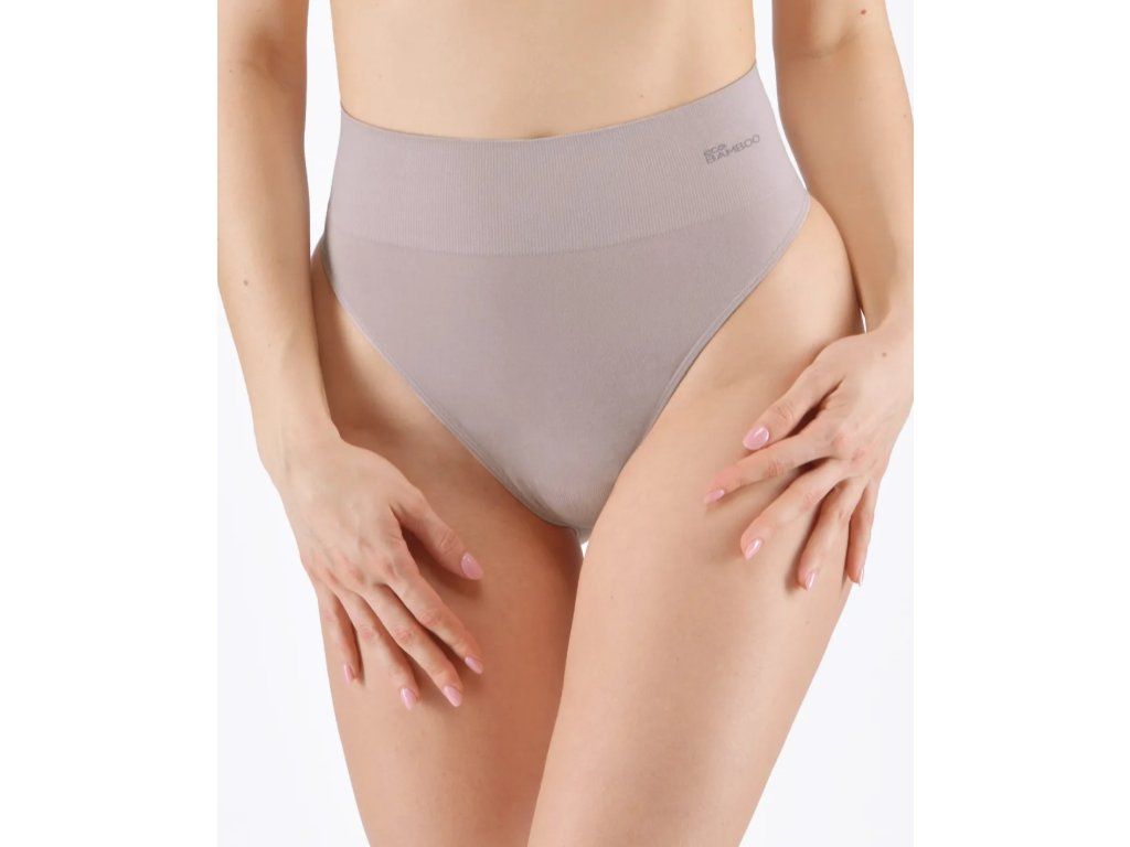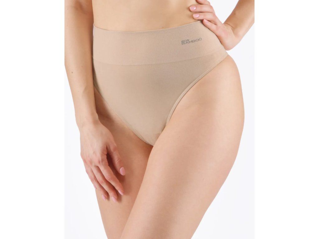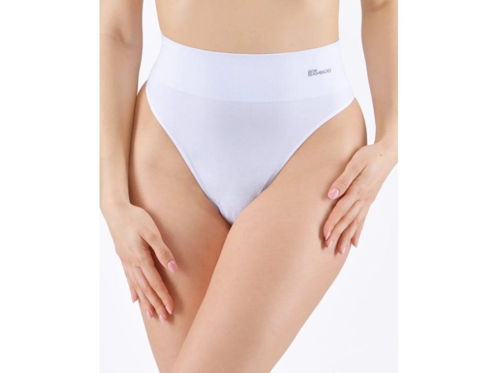 Kalhotky klasického střihu s vysokým bokem a širokou pasovou záložkou, dámské bezešvé prádlo. Pasový kraj je zesílený a zapravený bezešvým způsobem. V nohavičkách je zašitá úzká pruženka. Kalhotky jsou jednobarevné. V záložce je vypletené logo.