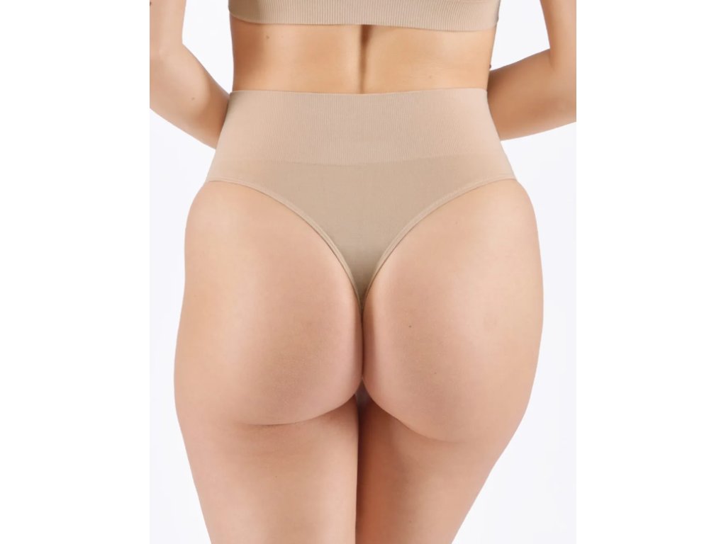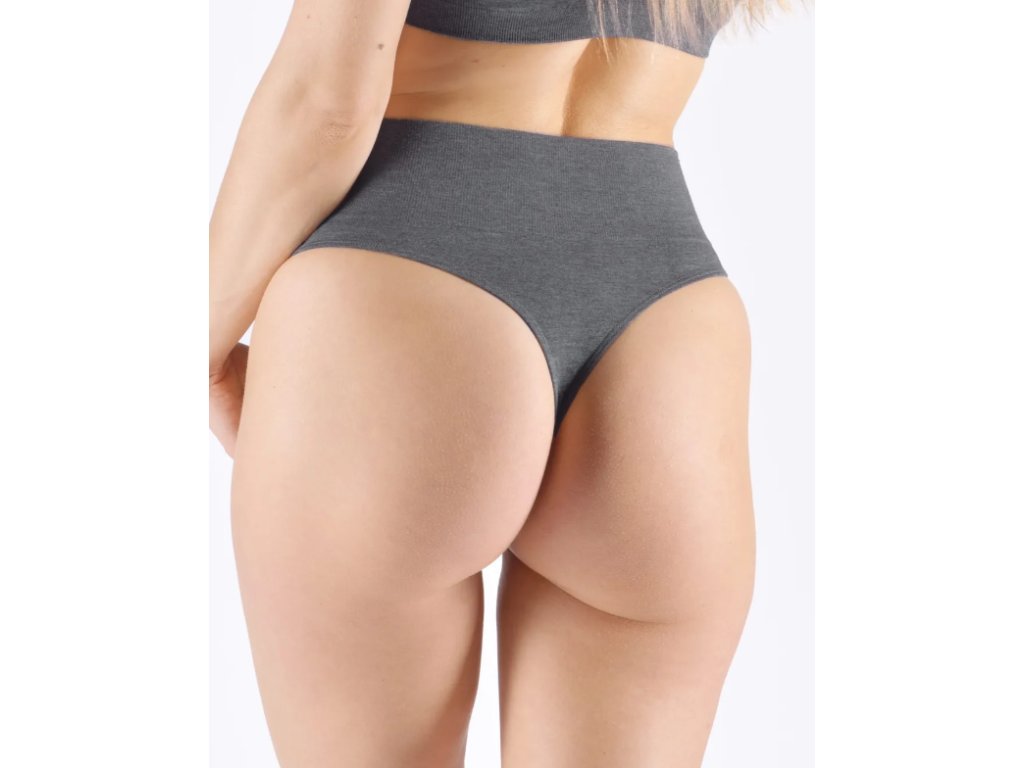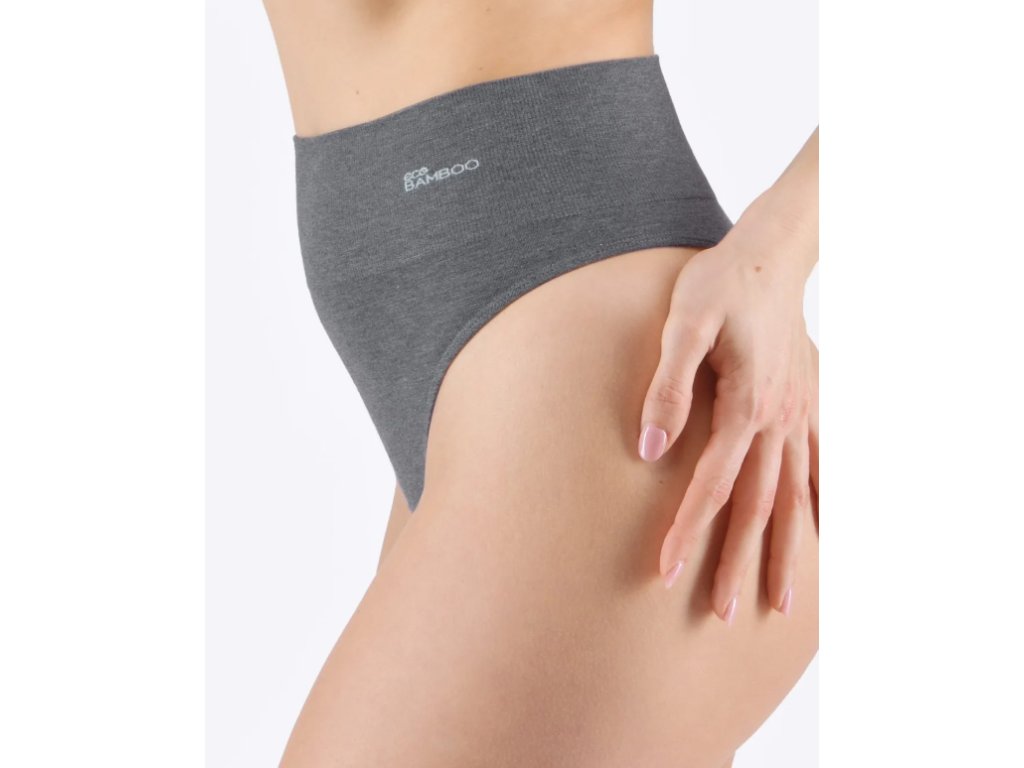 Kalhotky klasického střihu s vysokým bokem a širokou pasovou záložkou, dámské bezešvé prádlo. Pasový kraj je zesílený a zapravený bezešvým způsobem. V nohavičkách je zašitá úzká pruženka. Kalhotky jsou jednobarevné. V záložce je vypletené logo.