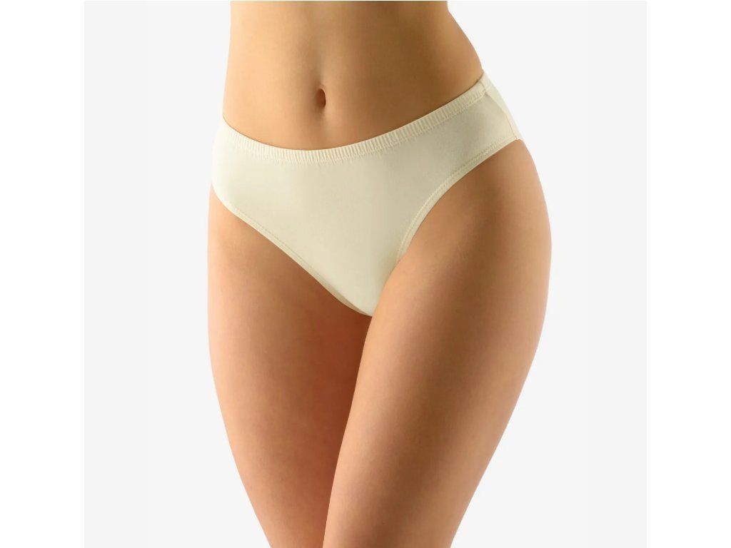 Kalhotky klasického střihu, dámské šité prádlo. V pasovém kraji je zašitá úzká pruženka. V nohavičkách je zašitá úzká pruženka. Kalhotky jsou jednobarevné.