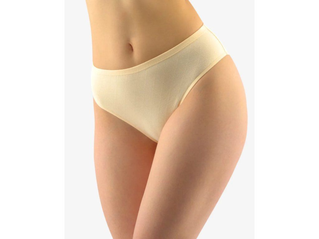 Kalhotky klasického střihu, dámské šité prádlo. V pasovém kraji je zašitá úzká pruženka. V nohavičkách je zašitá úzká pruženka. Kalhotky jsou jednobarevné zdobené jemným žakárovým vzorem na předním i zadním díle.