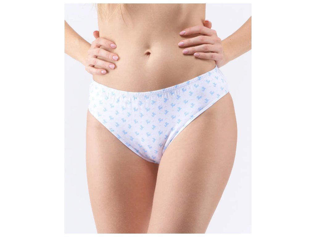 Kalhotky klasického střihu, dámské šité prádlo. V pasovém kraji je zašitá úzká pruženka. V nohavičkách je zašitá úzká pruženka. Kalhotky jsou potištěné.
