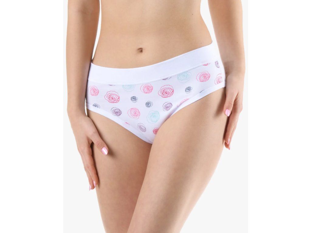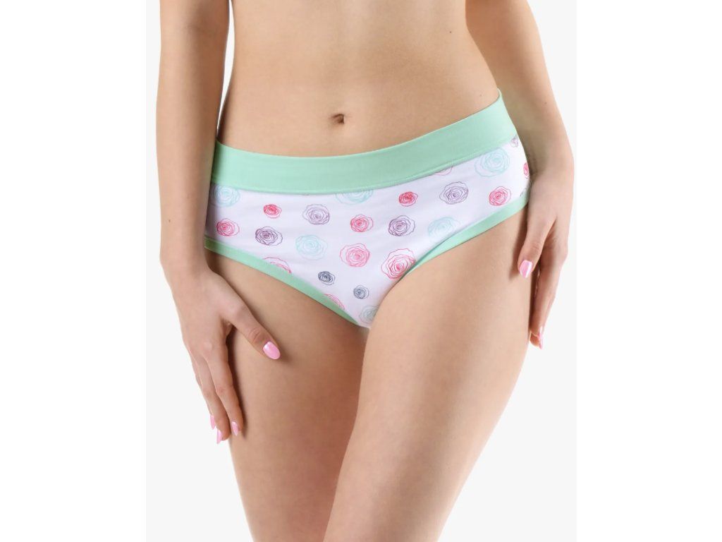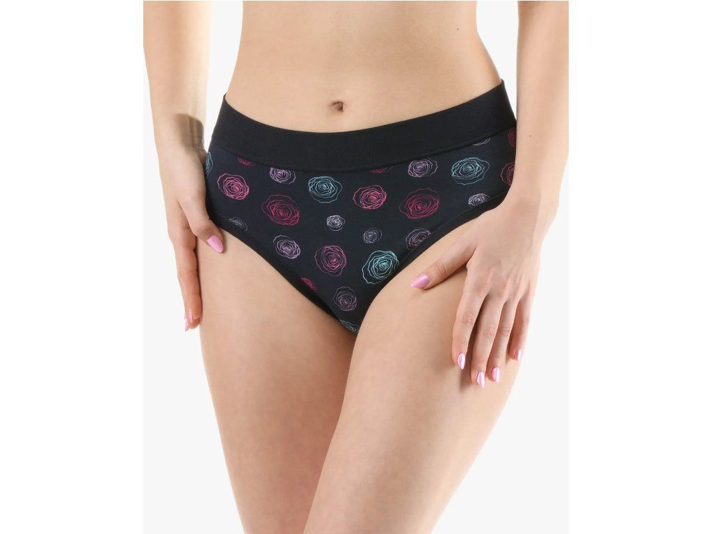 Kalhotky klasického střihu se širším pasovým lemem, dámské šité prádlo. Pasový kraj je začištěný širším lemem ze stejného materiálu. Nohavičky jsou začištěné úzkým lemem ze stejného materiálu. Přední díl je potištěný. Zadní díl a lemy jsou jednobarevné.