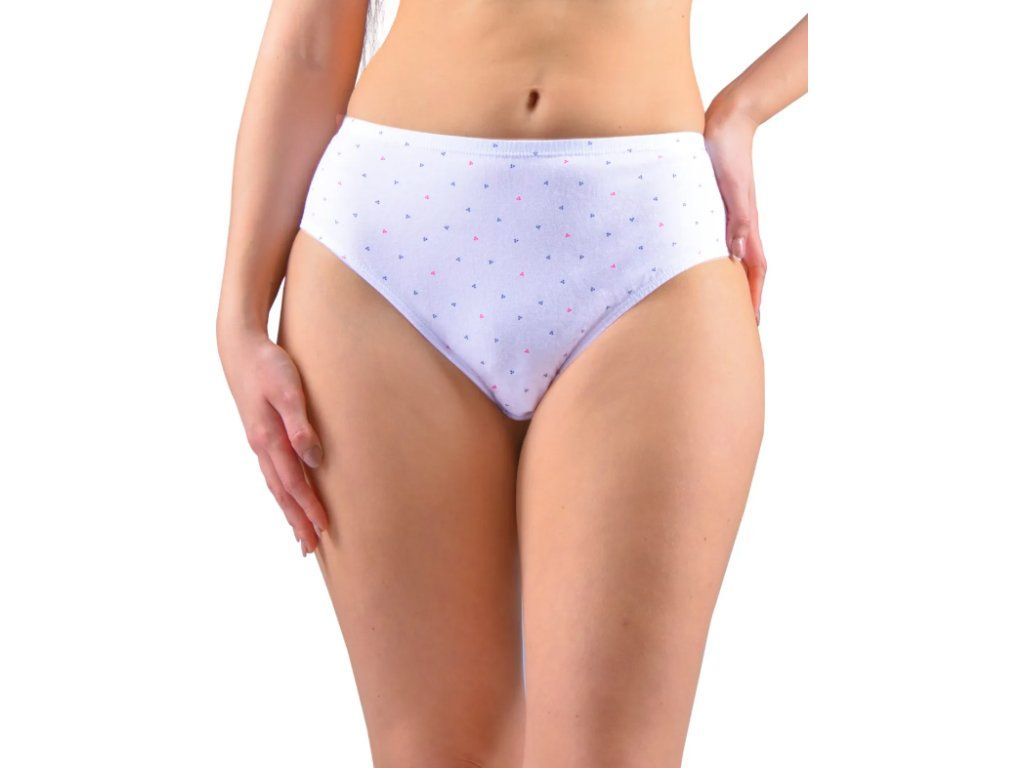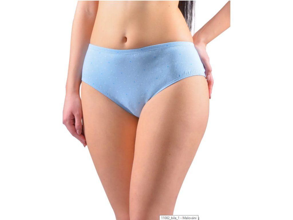 Kalhotky klasického střihu ve větších velikostech, dámské šité prádlo. V pasovém kraji je zašitá úzká pruženka. V nohavičkách je zašitá úzká pruženka. Kalhotky jsou potištěné drobným vzorem.