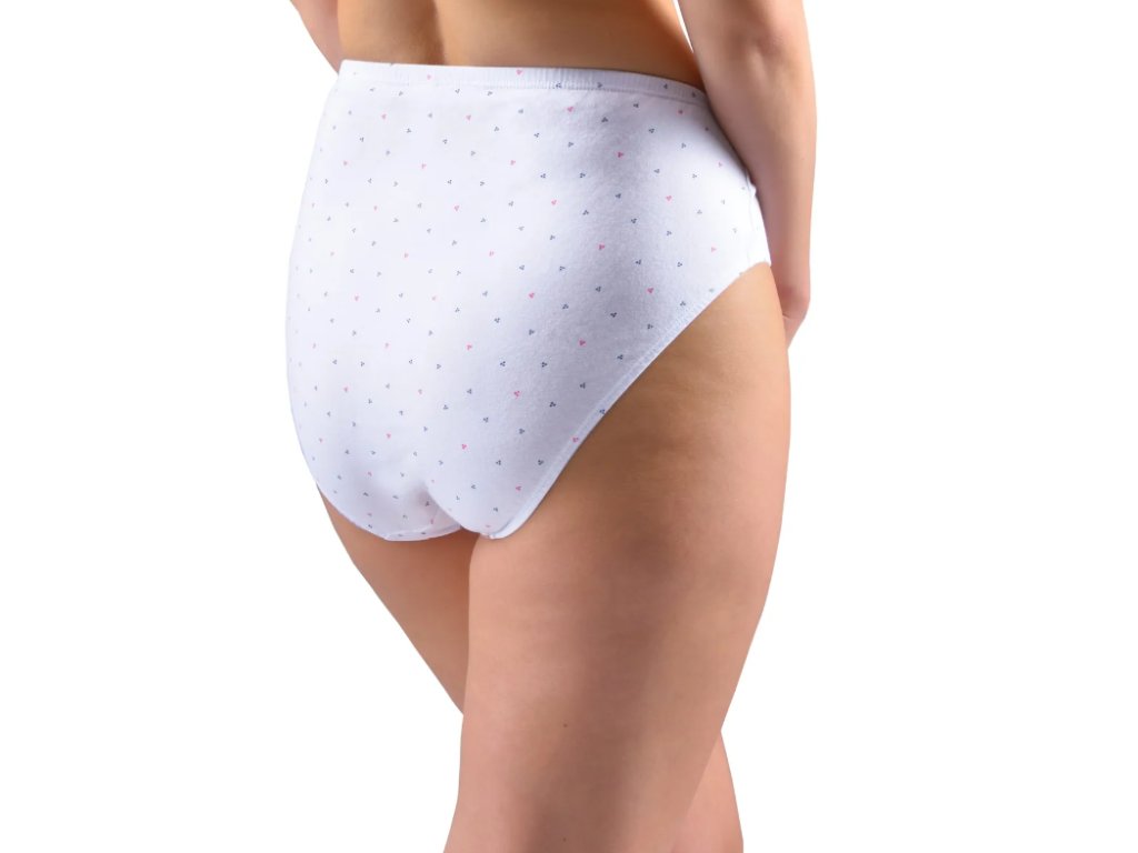 Kalhotky klasického střihu ve větších velikostech, dámské šité prádlo. V pasovém kraji je zašitá úzká pruženka. V nohavičkách je zašitá úzká pruženka. Kalhotky jsou potištěné drobným vzorem.