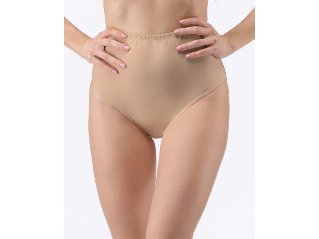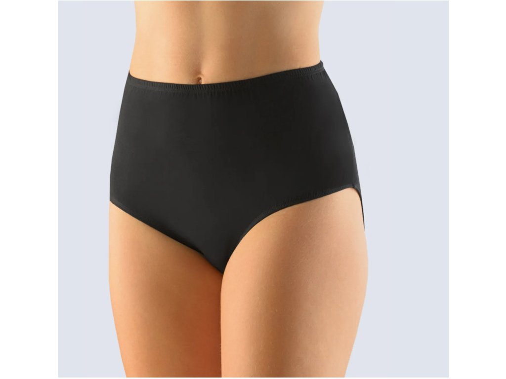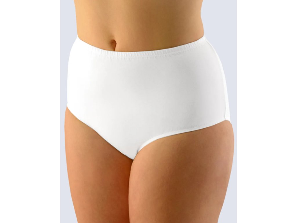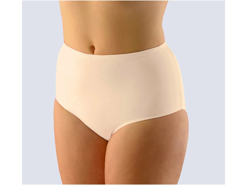 Kalhotky klasického střihu se širším bokem ve větších velikostech, dámské šité prádlo. V pasovém kraji je zašitá úzká pruženka. V nohavičkách je zašitá úzká pruženka. Kalhotky jsou jednobarevné.