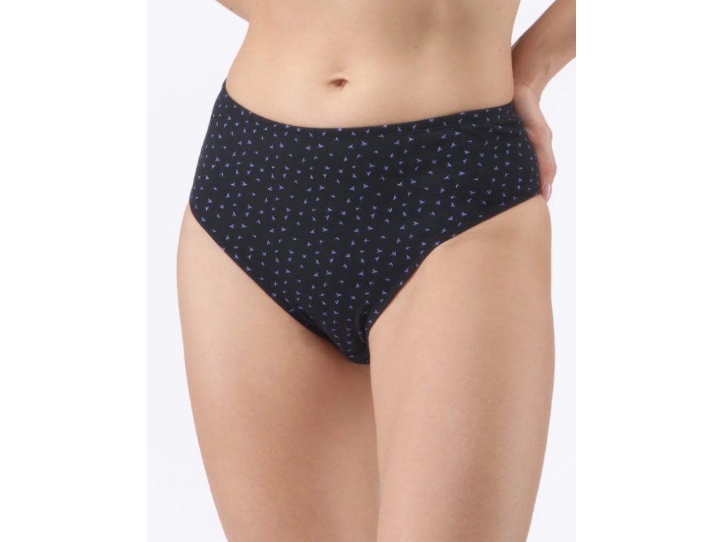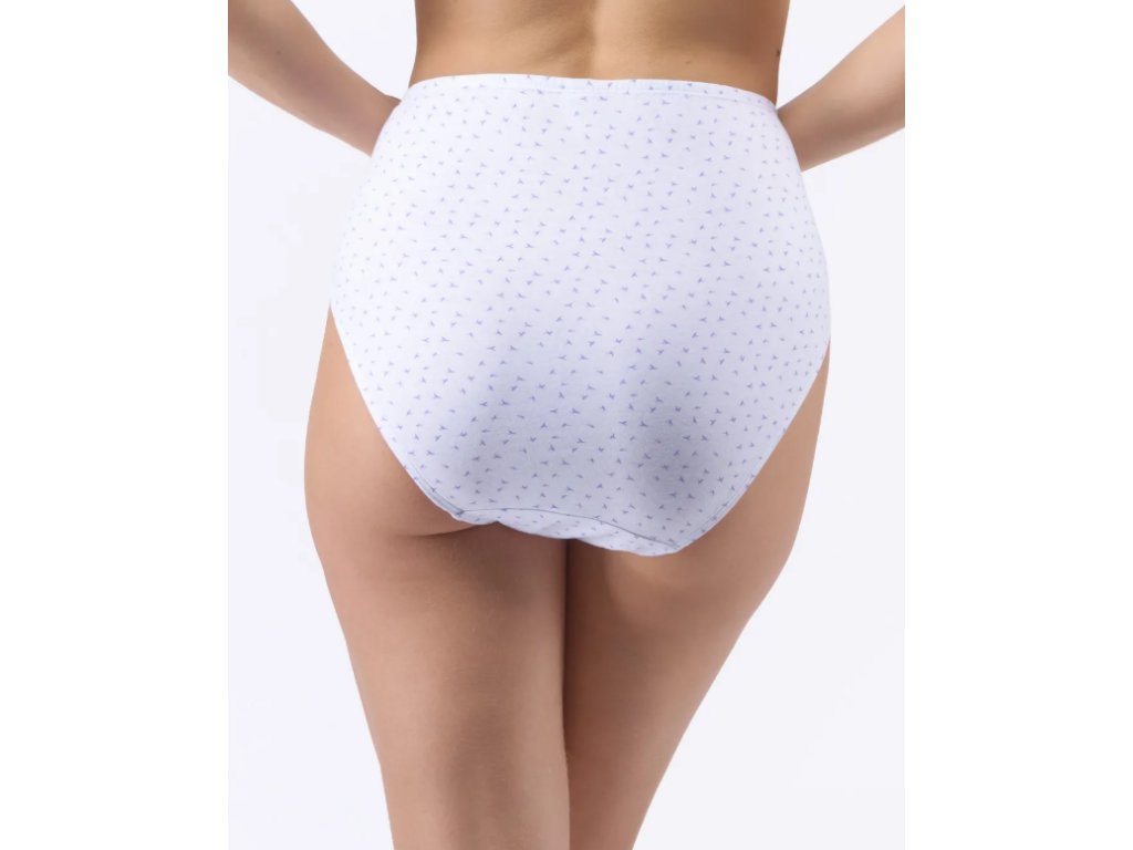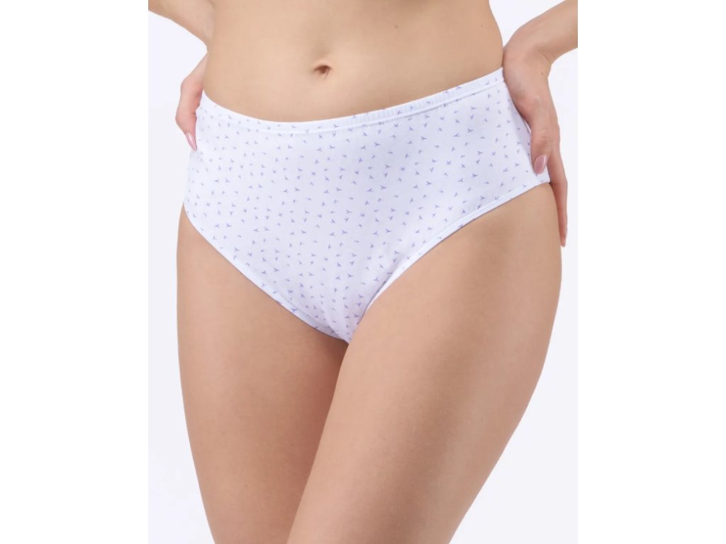 Kalhotky klasického střihu ve větších velikostech, dámské šité prádlo. V pasovém kraji je zašitá úzká pruženka. V nohavičkách je zašitá úzká pruženka. Kalhotky jsou potištěné drobným vzorem.
