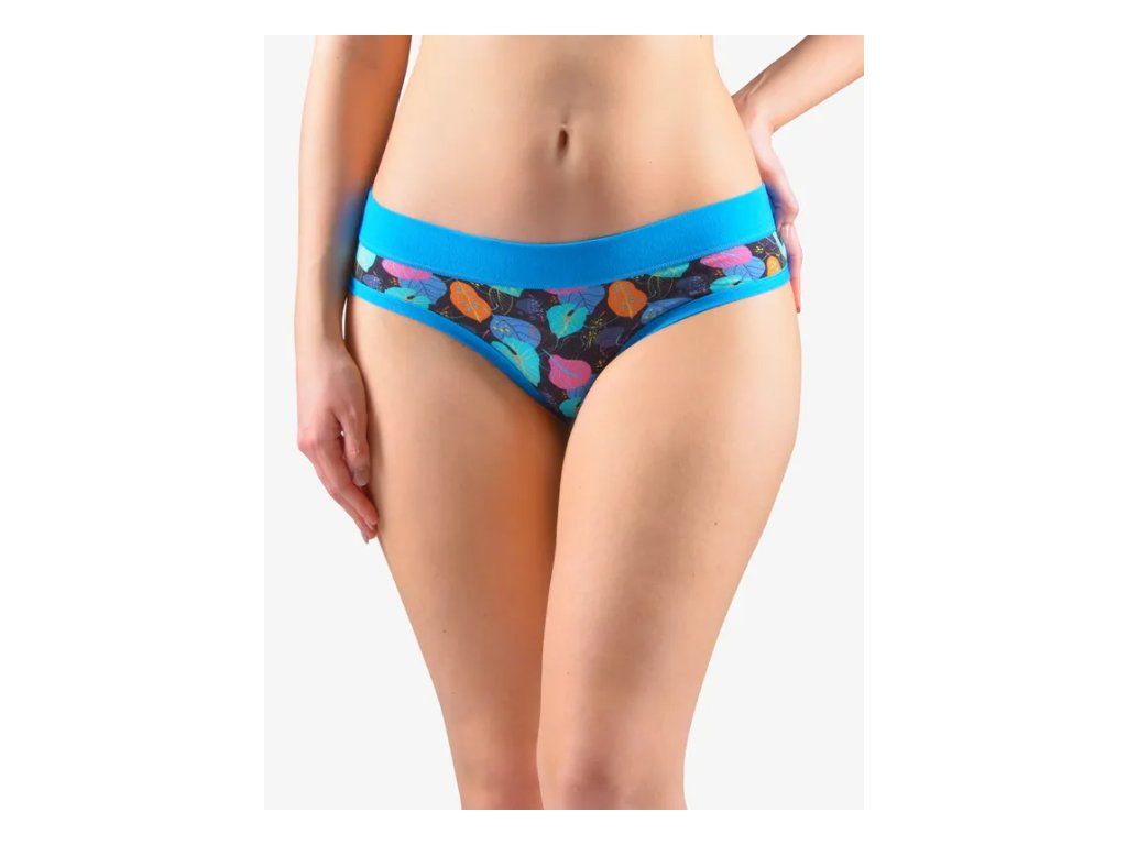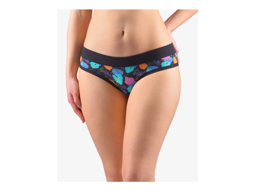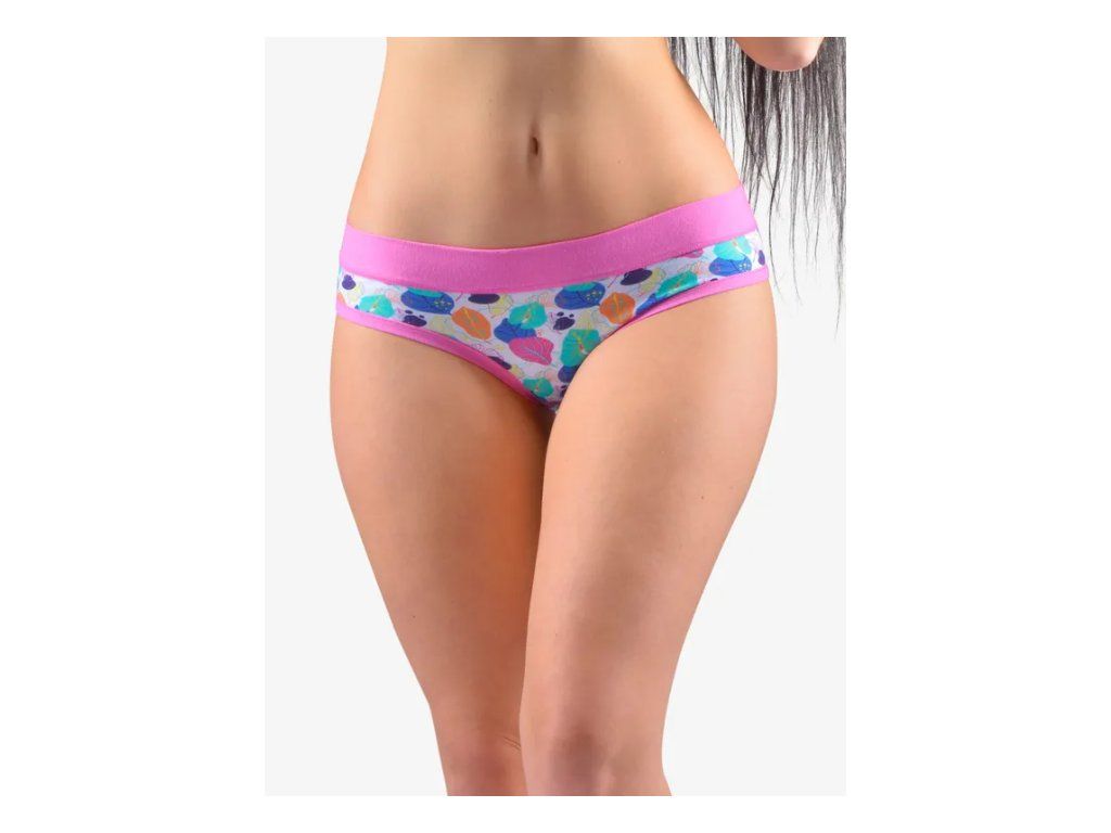 Bokové kalhotky francouzského střihu se širokým bokem a širším pasovým lemem, dámské šité prádlo. Pasový kraj je začištěný širším lemem ze stejného materiálu. Nohavičky jsou začištěné úzkým lemem ze stejného materiálu. Přední díl je potištěný. Zadní díl a lemy jsou jednobarevné.