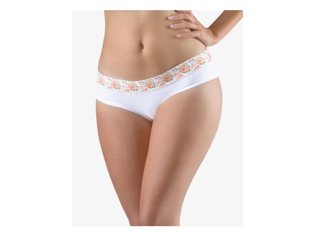 Bokové kalhotky francouzského střihu se širokým bokem a širším pasovým lemem, dámské šité prádlo. Pasový kraj je začištěný širším lemem ze stejného materiálu, zdobí ho potisk s kytičkami. Nohavičky jsou začištěné úzkým lemem ze stejného materiálu. Přední a zadní díl a lemy v nohavičkách jsou jednobarevné.