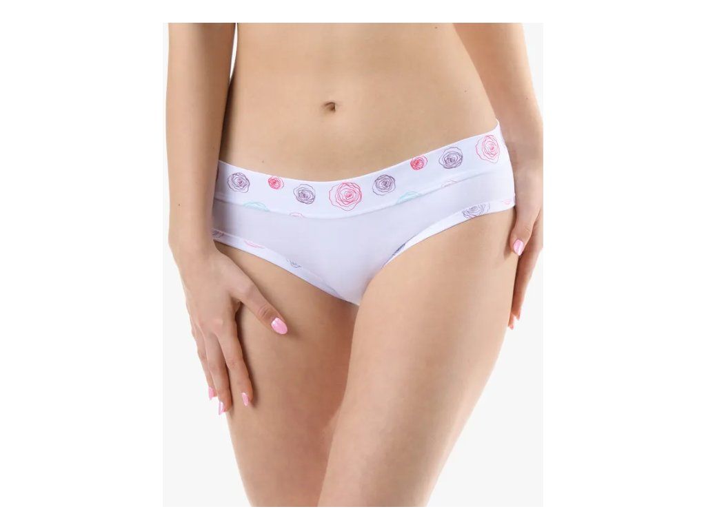 Bokové kalhotky francouzského střihu se širokým bokem a širším pasovým lemem, dámské šité prádlo. Pasový kraj je začištěný širším lemem ze stejného materiálu. Nohavičky jsou začištěné úzkým lemem ze stejného materiálu. Lemy v pase a v nohavičkách jsou potištěné, přední a zadní díl je jednobarevný.