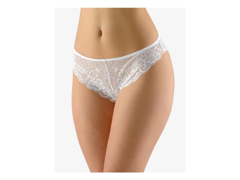 Boková tanga s úzkým bokem, dámské šité prádlo. V pasovém kraji je našitá pruženka s ozdobným krajem. Kalhotky jsou celokrajkové, uvnitř je všitý bavlněný klínek. Kalhotky jsou jednobarevné.