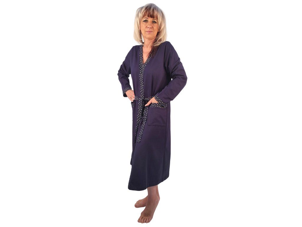 Dámský bavlněný župan vyrobený z kvalitního úpletu. Délka sahá pod kolena. Dlouhý rukáv. V pase pásek, po stranách prostorné kapsy. Lem je zdobený jemnými bílými puntíčky.Doplňkové parametry