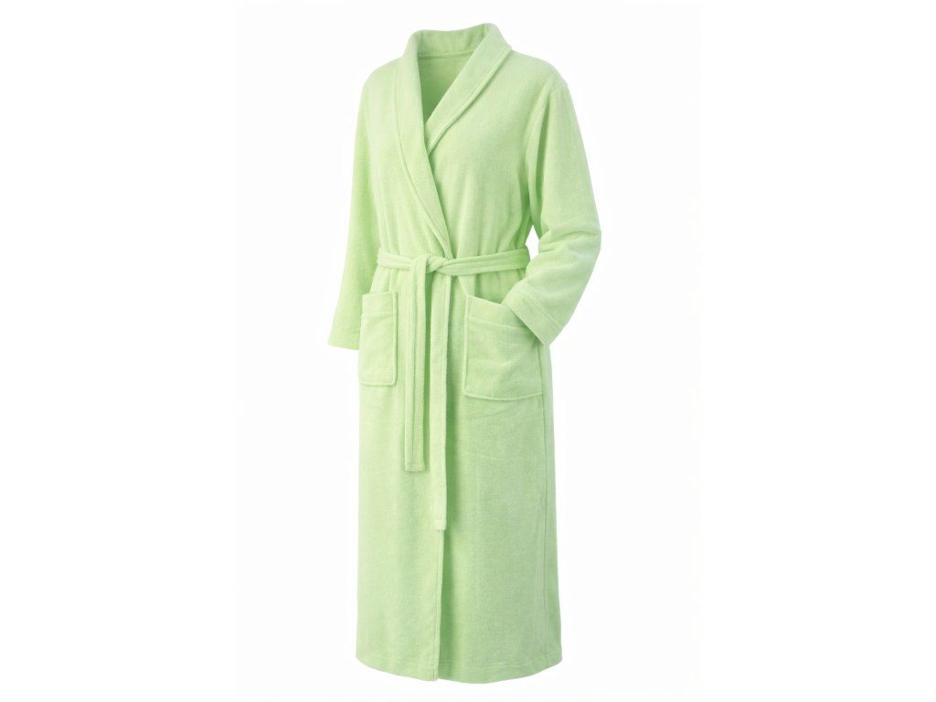 Dámský dlouhý župan s délkou sahající pod kolena. Vyrobený ze silného bavlněného froté materiálu. Župan je s límečkem, bez kapuce. V pase pásek ve stejné barvě. Po stranách kapsy.