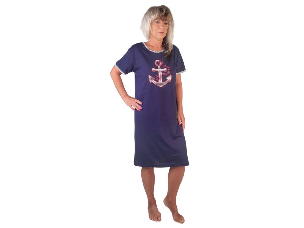 Dámská krátká noční košile s potiskem na jednobarevném podkladu. Vyrobena z velmi příjemné certifikované bavlny. Krátké rukávy a výstřih olemované barevnou lemovkou. Celá košile obšitá kontrastní lemovkou.