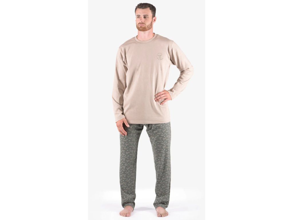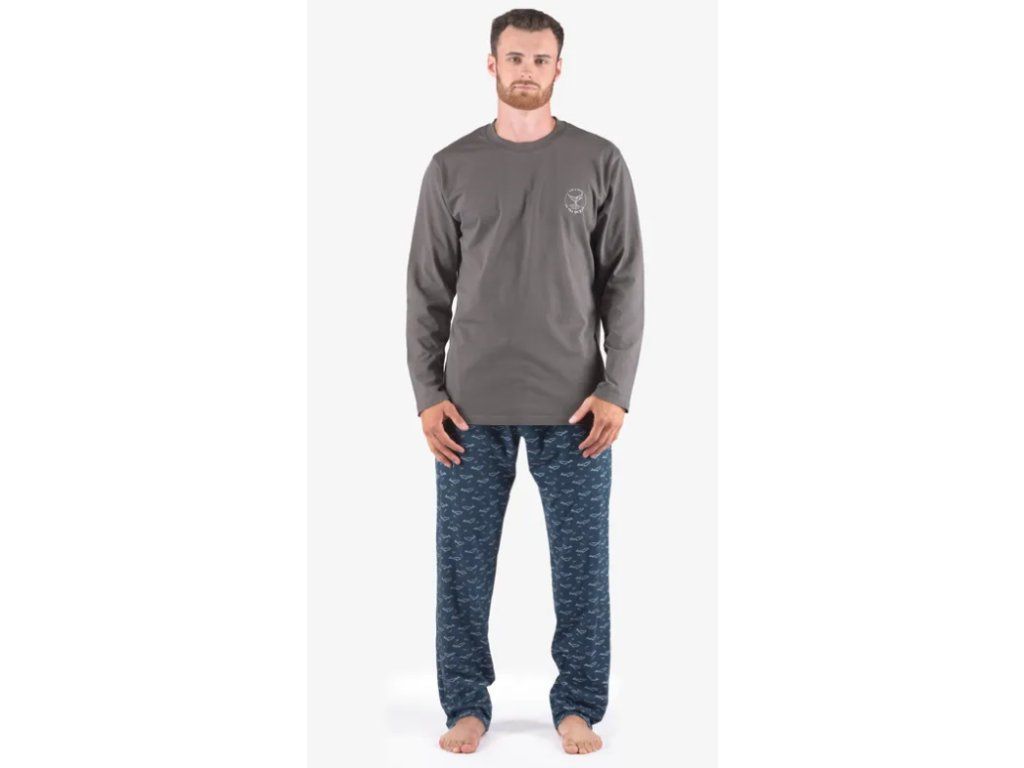Pánské klasické pyžamo volného střihu z jemného úpletu Vám poskytne pohodlí během spánku. Potisk velryby je na kalhotách i na hrudi trika s dlouhými rukávy.