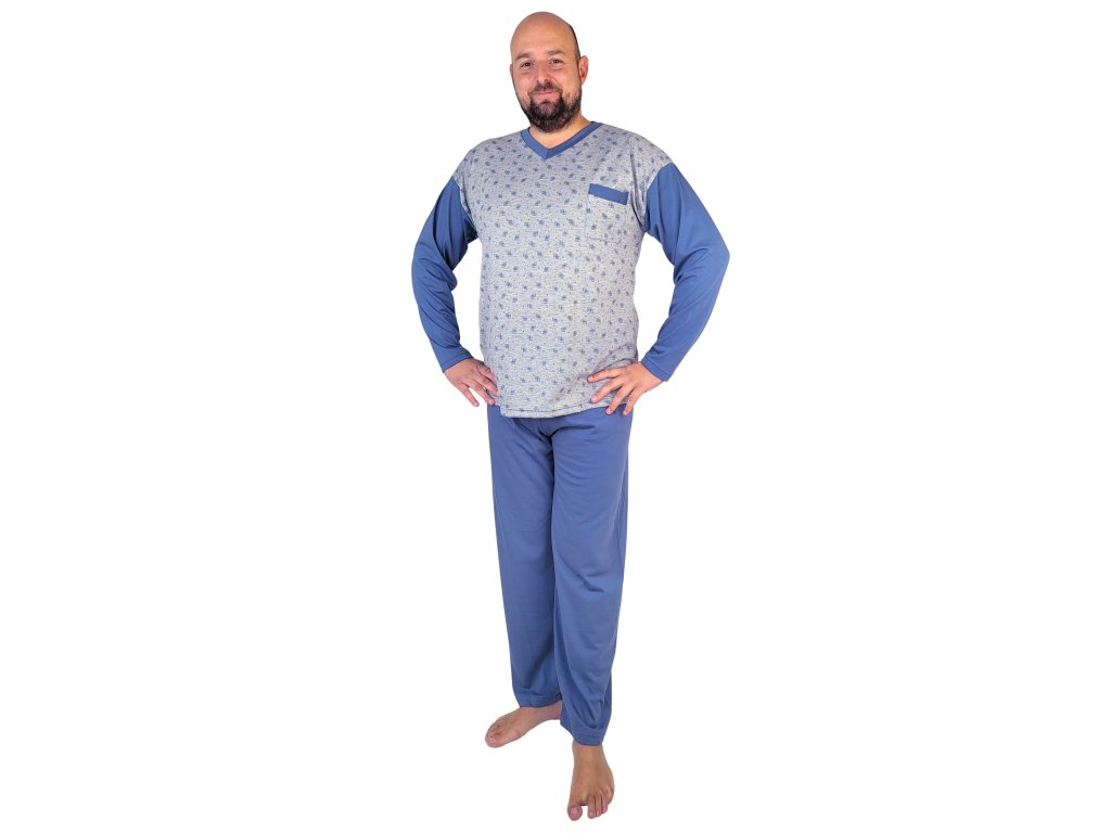 Pánské dlouhé bavlněné pyžamo. Velmi zajímavý elegantní vzor. Střih pyžama je volného strihu s výstřihem do V. Zakončení rukávů a kalhot je bez nápletu (manžety). Lem u krku je v barvě kalhot. Na prsou kapsička.