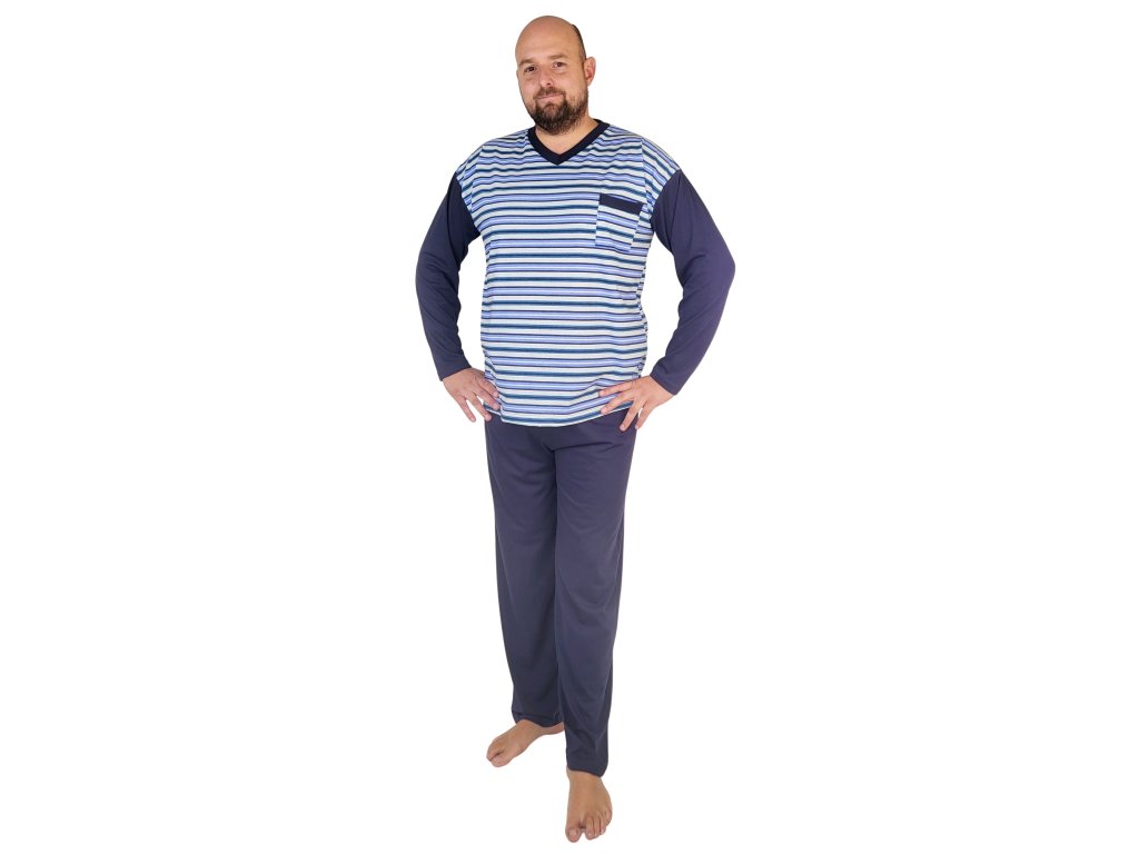 Pánské dlouhé bavlněné pyžamo. Velmi zajímavý elegantní vzor. Střih pyžama je volného strihu s výstřihem do V. Zakončení rukávů a kalhot je bez nápletu (manžety). Lem u krku je v barvě kalhot. Na prsou kapsička.