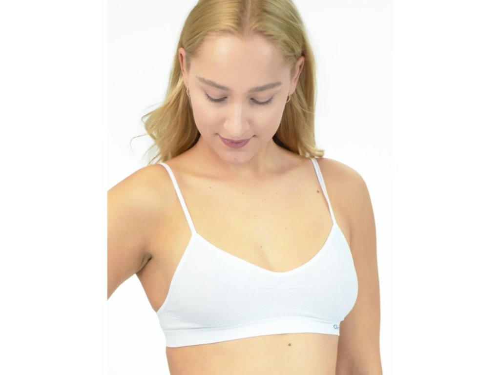 Podprsenkový top s úzkými ramínky, dámské bezešvé prádlo. Dolní kraj je zesílený a zapravený bezešvým způsobem. Průramky a průkrčník jsou začištěny lemovacími proužky, které přechází do ramínek. Top je jednobarevný. V záložce je vypletené logo v šedé barvě.
