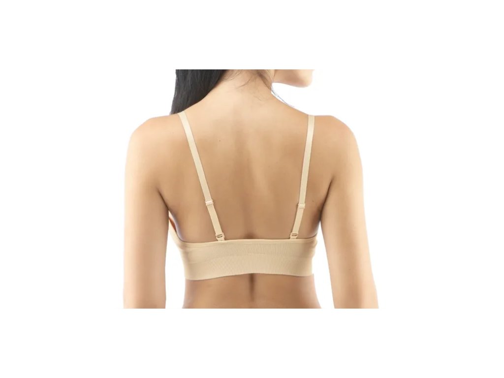 Podprsenka bez kostic s vyjímatelnými vycpávkami a nastavitelnými ramínky, dámské bezešvé sportovní prádlo. Dolní kraj je zesílený a zapravený bezešvým způsobem. Horní kraj je zapravený lemovkou. Přední díl je dvojitý a mezi vnější a vnitřní část jsou vloženy lisované košíčky. Zadní díl je v celku. Ramínka jsou nastavitelná a díky použitým háčkům lze změnit jejich umístění na zadním díle. Podprsenka je jednobarevná. V záložce je vypletené logo.