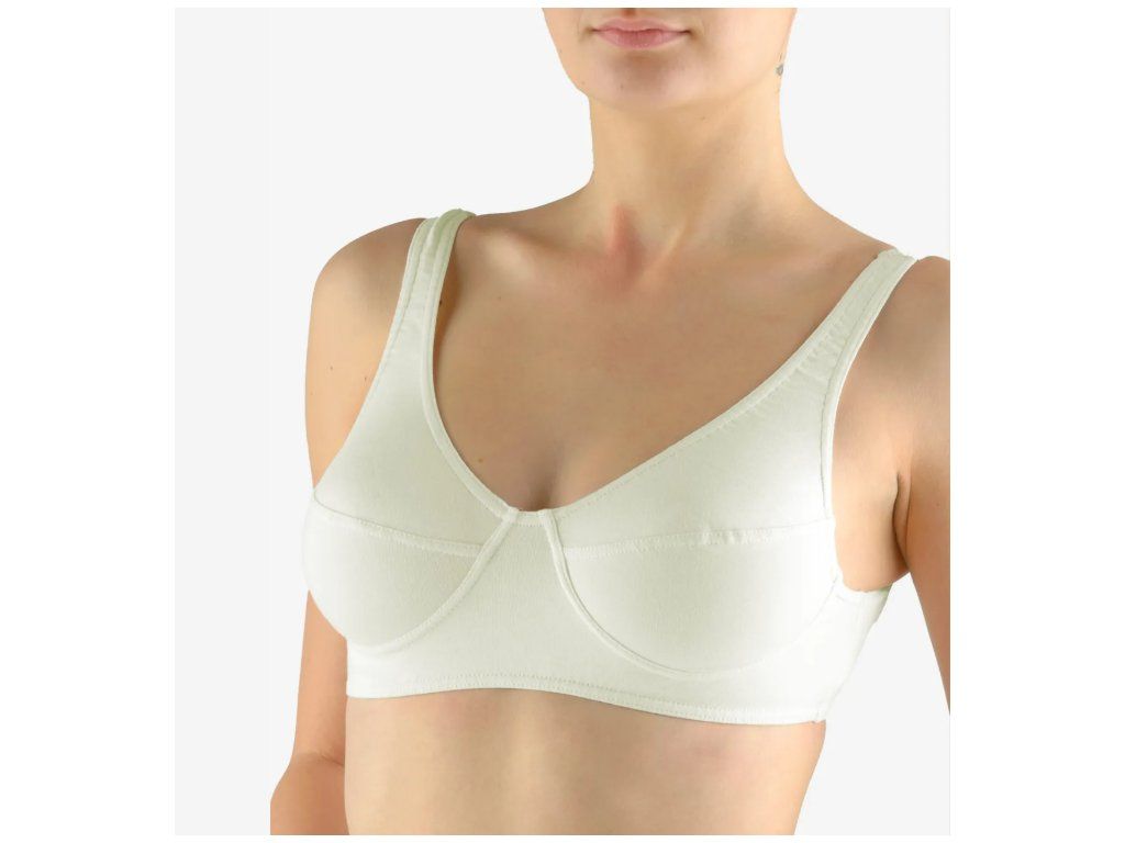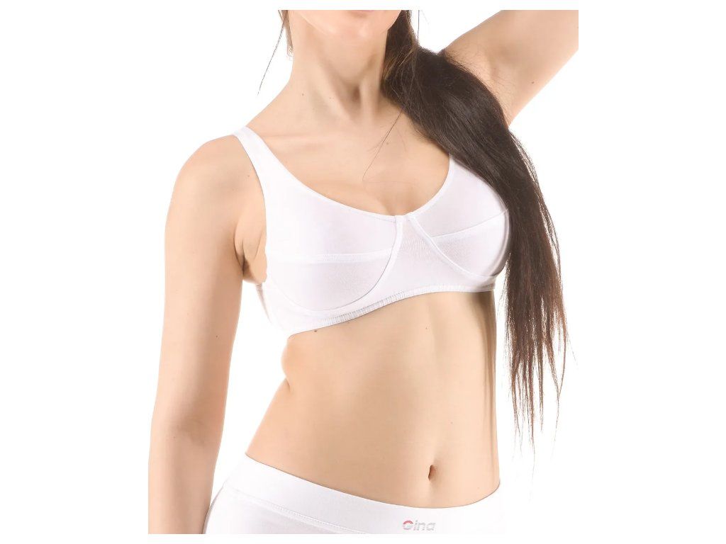 Podprsenka se širšími ramínky přes hlavu, dámské šité sportovní prádlo. V dolním kraji je zašitá úzká pruženka. V průramcích a průkrčníku je zašitá úzká pruženka. Podprsenka je jednobarevná.