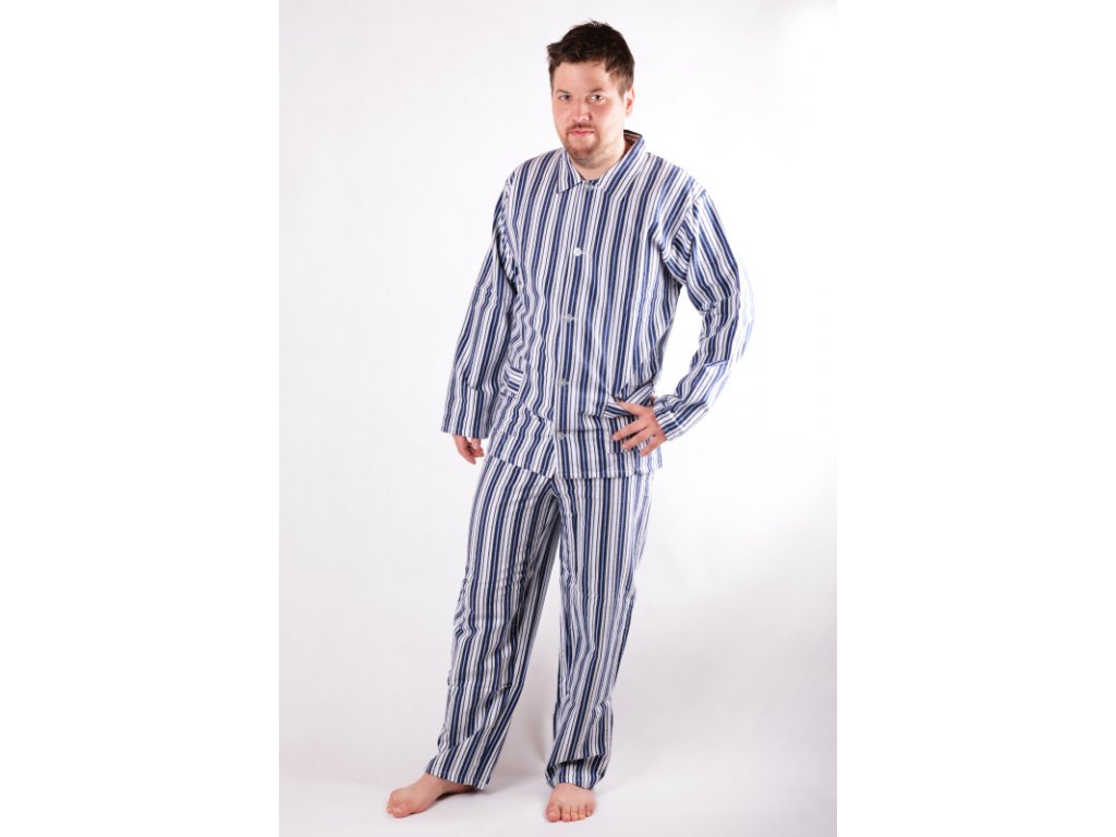 Pánské dlouhé pyžamo z flanelu ze 100% bavlny. Kabátek je celopropínací na knoflíky a se dvěma bočními kapsami. Kalhoty jsou volné s vyměnitelnou gumou.